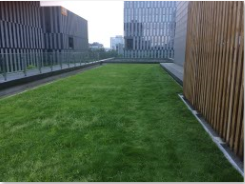 草坪式屋顶绿化采用抗逆性强的草本植被平铺栽植于屋顶绿化结构层上,一般选用的草坪植物为佛甲草。草坪式屋顶绿化重量轻,适用范围广,养护投入少。此型可用于那些屋顶承重差,面积小的住房。